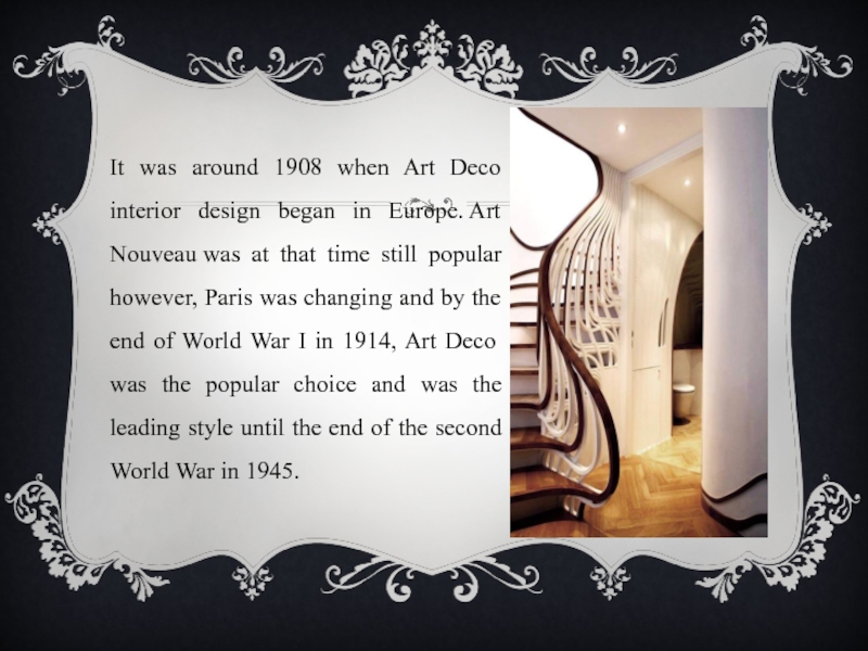 Europe. Art Nouveau was at that time still popular however, Paris was changing and by the end of World War I in 1914, Art Deco was the popular choice and was the leading style until the end of the second World War in 1945.