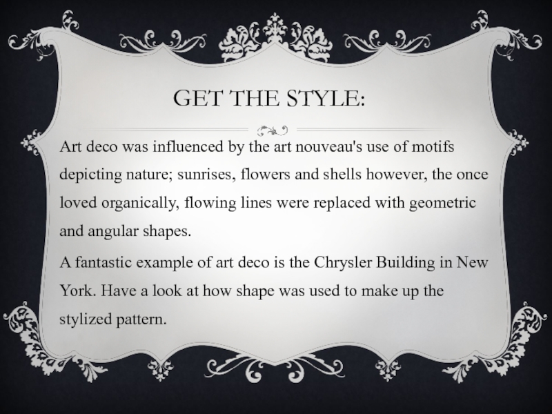 Get the style: Art deco was influenced by the art nouveau's use of motifs depicting nature; sunrises,
