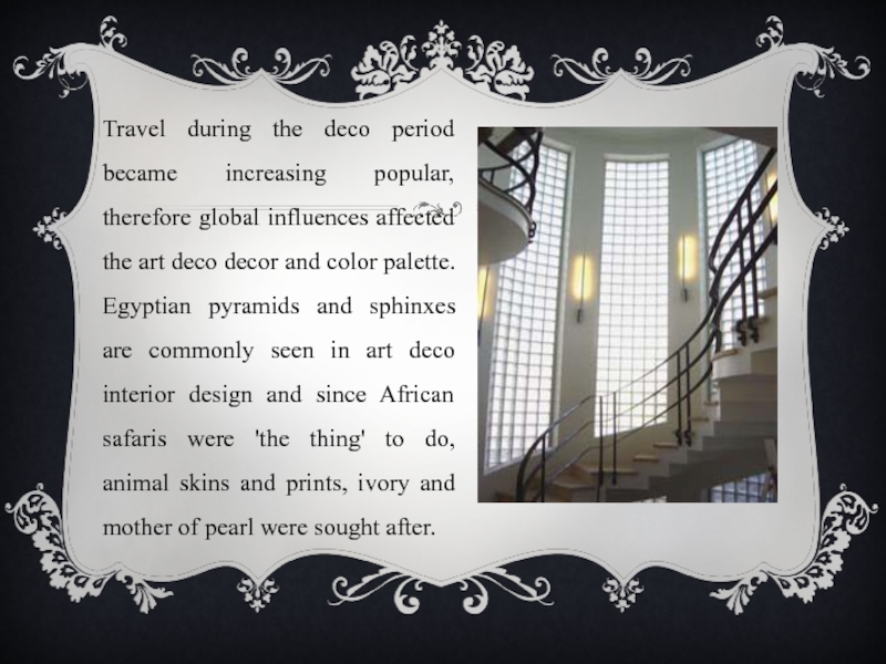 Слайд 6Travel during the deco period became increasing popular, therefore global influences