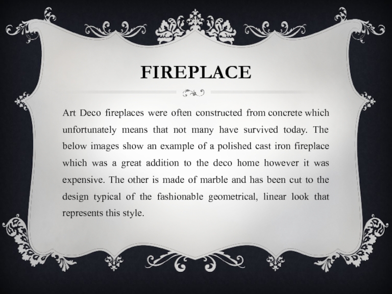 FireplaceArt Deco fireplaces were often constructed from concrete which unfortunately means that not many have survived today. The below