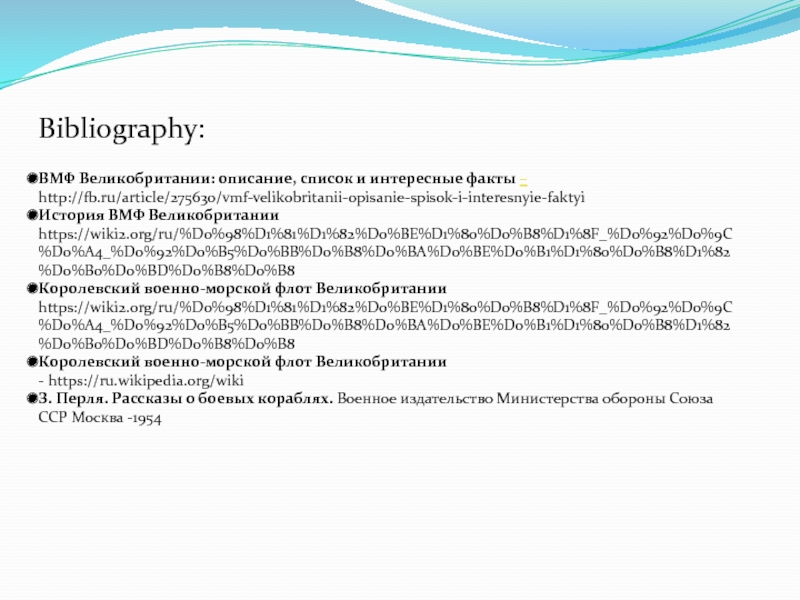Bibliography:ВМФ Великобритании: описание, список и интересные факты – http://fb.ru/article/275630/vmf-velikobritanii-opisanie-spisok-i-interesnyie-faktyiИстория ВМФ Великобритании https://wiki2.org/ru/%D0%98%D1%81%D1%82%D0%BE%D1%80%D0%B8%D1%8F_%D0%92%D0%9C%D0%A4_%D0%92%D0%B5%D0%BB%D0%B8%D0%BA%D0%BE%D0%B1%D1%80%D0%B8%D1%82%D0%B0%D0%BD%D0%B8%D0%B8Королевский военно-морской флот Великобританииhttps://wiki2.org/ru/%D0%98%D1%81%D1%82%D0%BE%D1%80%D0%B8%D1%8F_%D0%92%D0%9C%D0%A4_%D0%92%D0%B5%D0%BB%D0%B8%D0%BA%D0%BE%D0%B1%D1%80%D0%B8%D1%82%D0%B0%D0%BD%D0%B8%D0%B8Королевский военно-морской флот