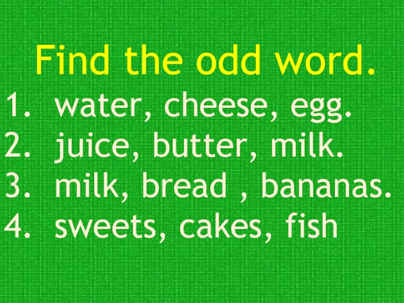 Find the odd word. water, cheese, egg. juice, butter, milk. milk, bread , bananas. sweets, cakes, fish