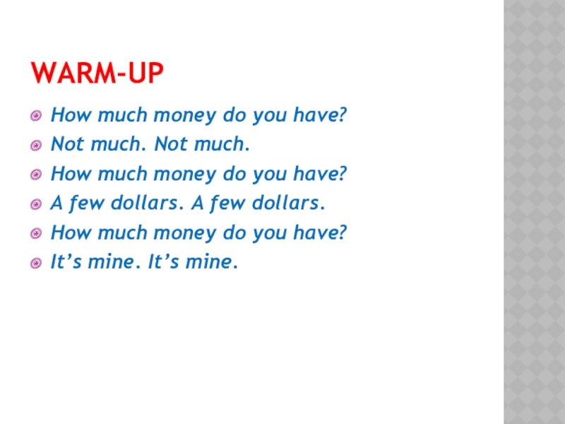 WARM-UPHow much money do you have?Not much. Not much.How much money do you have?A few dollars. A