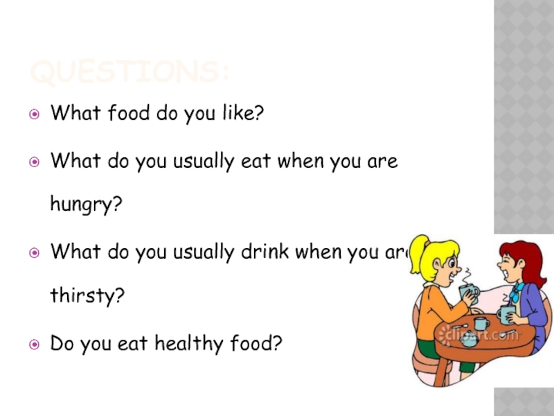 QUESTIONS:What food do you like?What do you usually eat when you are hungry?What do you usually drink