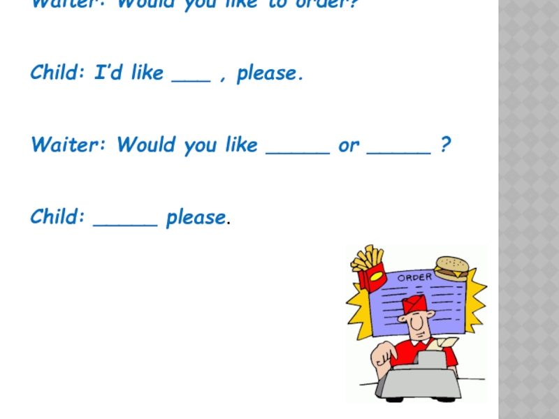 Waiter: Would you like to order?Child: I’d like ___ , please.Waiter: Would you like _____ or _____