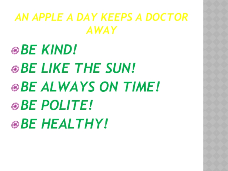 AN APPLE A DAY KEEPS A DOCTOR AWAYBE KIND!BE LIKE THE SUN!BE ALWAYS ON TIME!BE POLITE!BE HEALTHY!