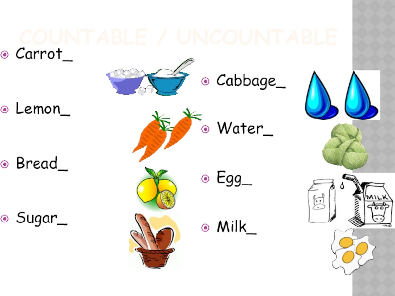 COUNTABLE / UNCOUNTABLECarrot_Lemon_Bread_Sugar_Cabbage_Water_Egg_Milk_