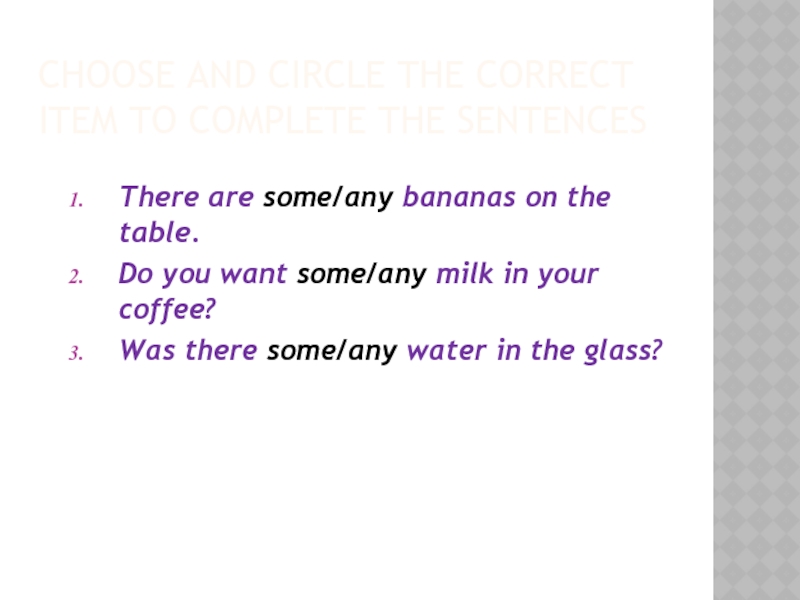 CHOOSE AND CIRCLE THE CORRECT ITEM TO COMPLETE THE SENTENCESThere are some/any bananas on the table.Do you