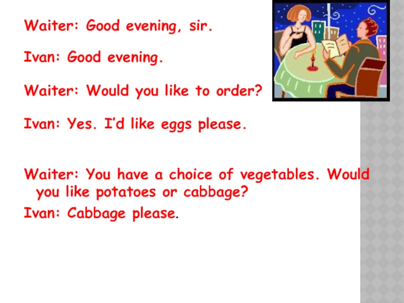 Waiter: Good evening, sir.Ivan: Good evening.Waiter: Would you like to order?Ivan: Yes. I’d like eggs please.Waiter: You