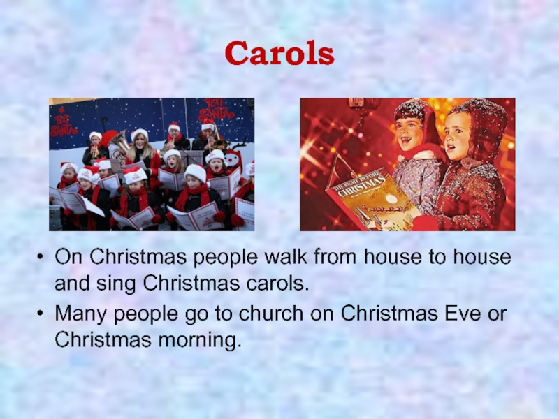 CarolsOn Christmas people walk from house to house and sing Christmas carols.Many people go to church on