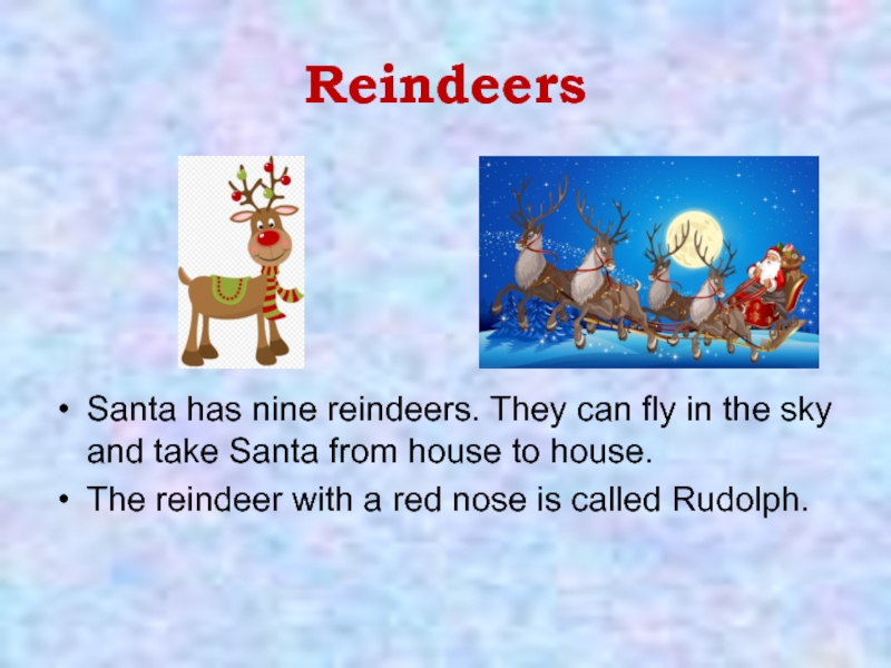 ReindeersSanta has nine reindeers. They can fly in the sky and take Santa from house to house.The