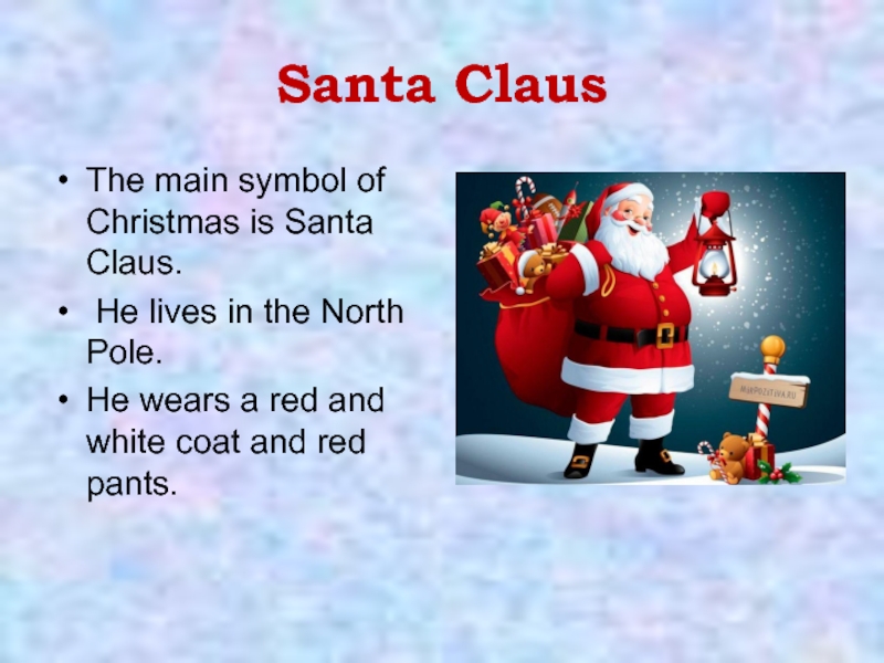 Santa ClausThe main symbol of Christmas is Santa Claus. He lives in the North Pole. He wears