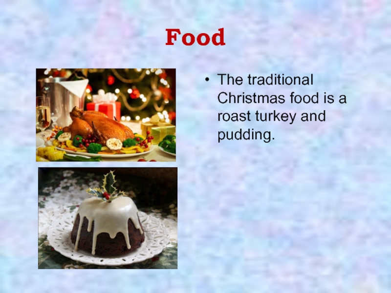 FoodThe traditional Christmas food is a roast turkey and pudding.