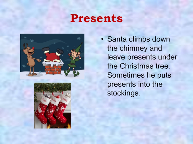 PresentsSanta climbs down the chimney and leave presents under the Christmas tree. Sometimes he puts presents into