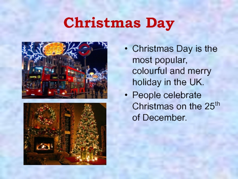 Christmas DayChristmas Day is the most popular, colourful and merry holiday in the UK.People celebrate Christmas on the 25th of December.