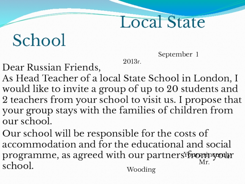 Dear Russian Friends, As Head Teacher of a local State School in London, I would like to invite a group of up to 20 students and 2 teachers from your school to visit us. I propose that your group stays with the families of children from our school.