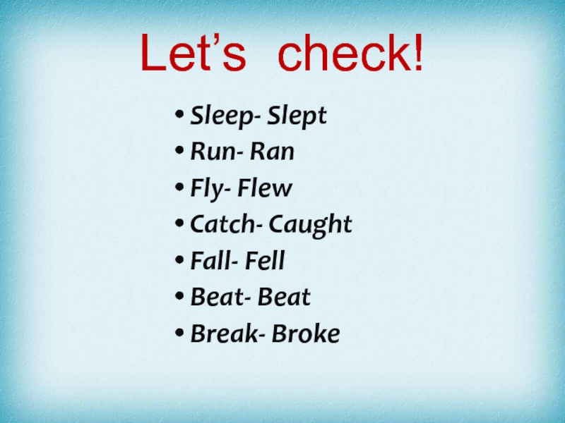 Let’s check!Sleep- SleptRun- RanFly- FlewCatch- CaughtFall- FellBeat- BeatBreak- Broke