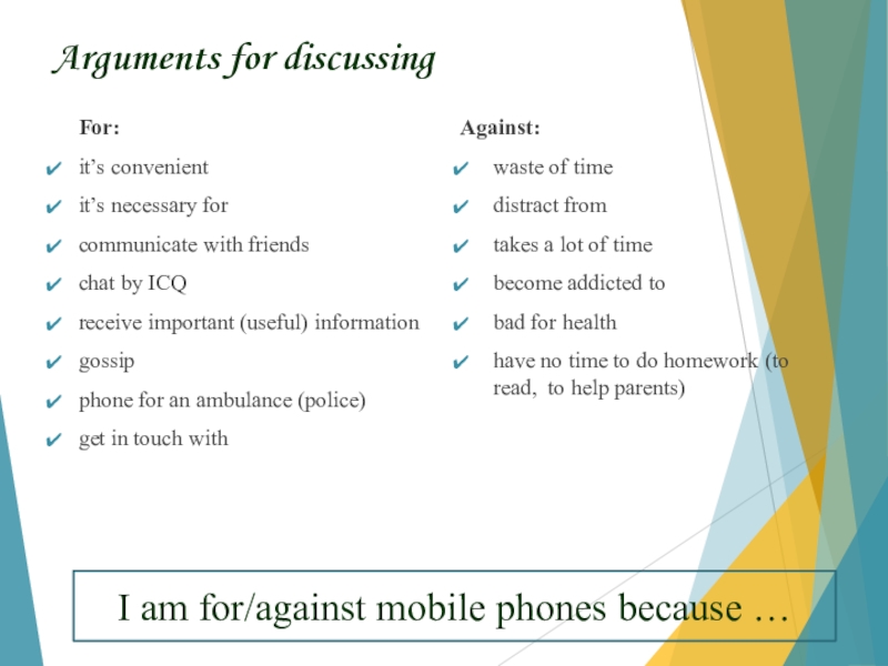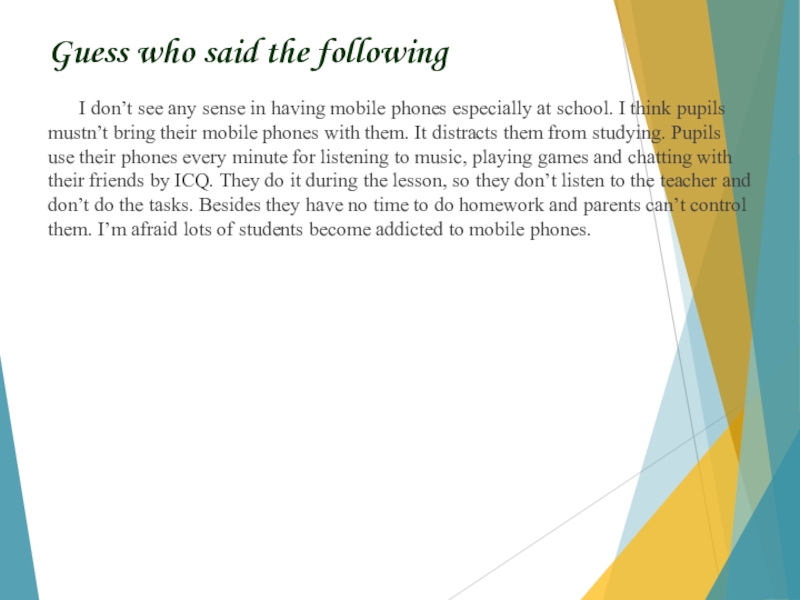 mobile phones especially at school. I think pupils mustn’t bring their mobile phones with them. It distracts them from studying. Pupils use their phones every minute for listening to music, playing games and chatting with their friends by ICQ. They do it during the lesson, so they don’t listen to the teacher and don’t do the tasks. Besides they have no time to do homework and parents can’t control them. I’m afraid lots of students become addicted to mobile phones.
