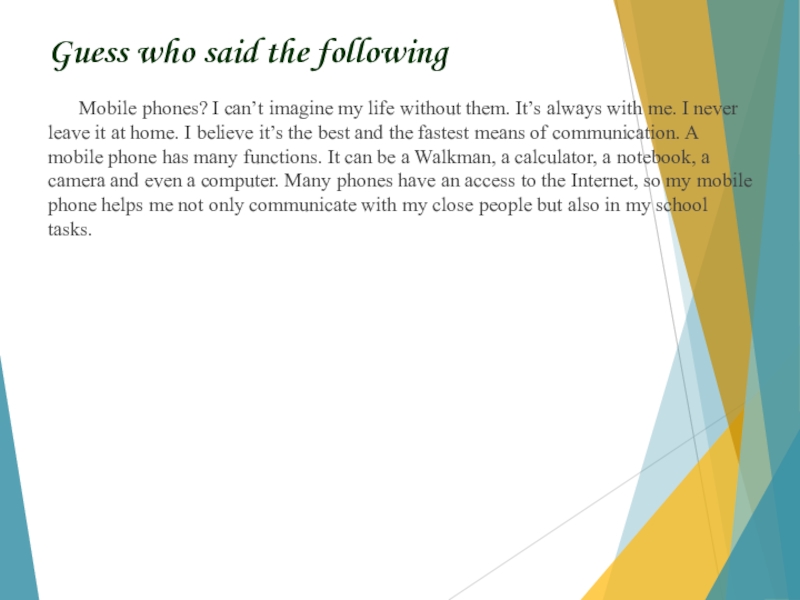 without them. It’s always with me. I never leave it at home. I believe it’s the best and the fastest means of communication. A mobile phone has many functions. It can be a Walkman, a calculator, a notebook, a camera and even a computer. Many phones have an access to the Internet, so my mobile phone helps me not only communicate with my close people but also in my school tasks.