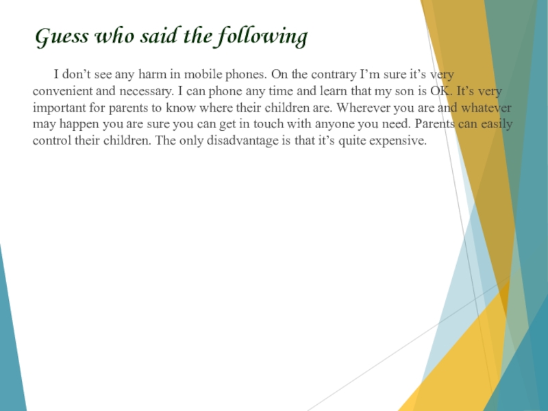 phones. On the contrary I’m sure it’s very convenient and necessary. I can phone any time and learn that my son is OK. It’s very important for parents to know where their children are. Wherever you are and whatever may happen you are sure you can get in touch with anyone you need. Parents can easily control their children. The only disadvantage is that it’s quite expensive.