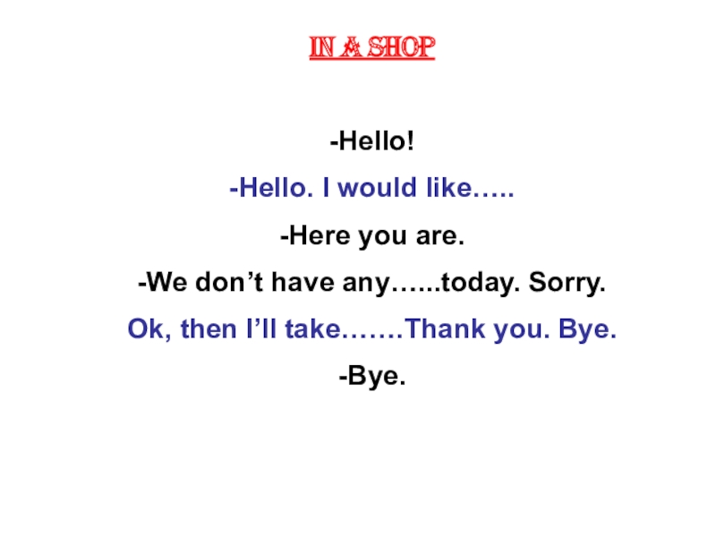 In a shop-Hello!-Hello. I would like…..-Here you are. -We don’t have any…...today. Sorry.Ok, then I’ll take…….Thank you.