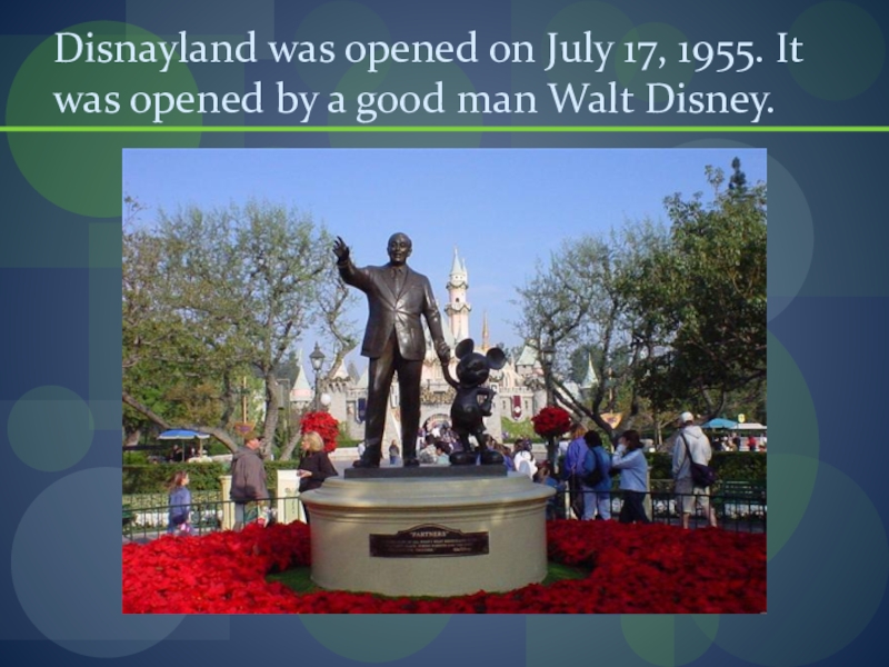 Слайд 3Disnayland was opened on July 17, 1955. It was opened by