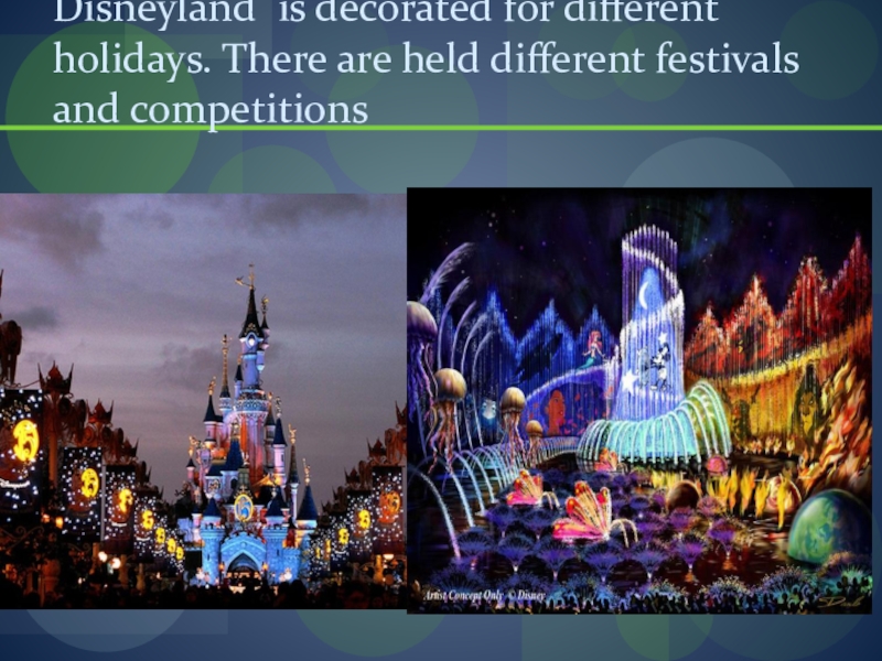 Слайд 6Disneyland is decorated for different holidays. There are held different festivals