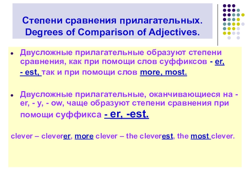 Двусложные прилагательные, оканчивающиеся на - er, - y, - ow, чаще образуют степени сравнения при помощи суффикса - er, -est.