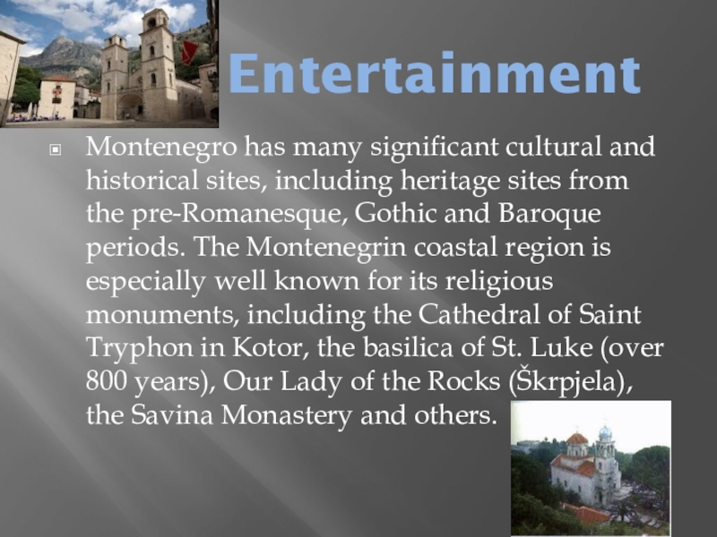 sites, including heritage sites from the pre-Romanesque, Gothic and Baroque periods. The Montenegrin coastal region is especially well known for its religious monuments, including the Cathedral of Saint Tryphon in Kotor, the basilica of St. Luke (over 800 years), Our Lady of the Rocks (Škrpjela), the Savina Monastery and others.