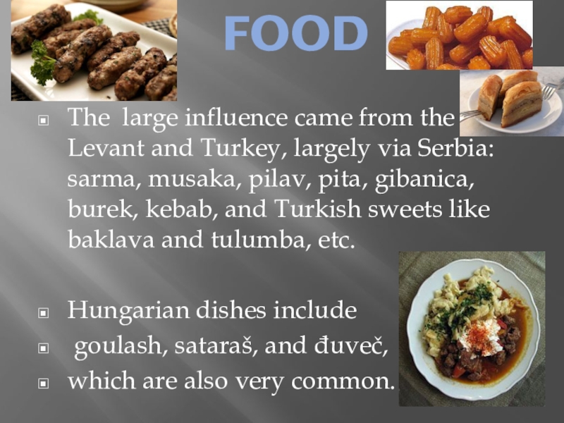 from the Levant and Turkey, largely via Serbia: sarma, musaka, pilav, pita, gibanica, burek, kebab, and Turkish sweets like baklava and tulumba, etc.