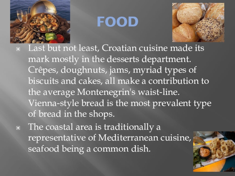 the desserts department. Crêpes, doughnuts, jams, myriad types of biscuits and cakes, all make a contribution to the average Montenegrin's waist-line. Vienna-style bread is the most prevalent type of bread in the shops.