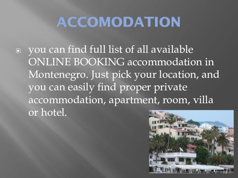 in Montenegro. Just pick your location, and you can easily find proper private accommodation, apartment, room, villa or hotel.