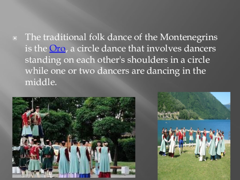 Слайд 16The traditional folk dance of the Montenegrins is the Oro, a