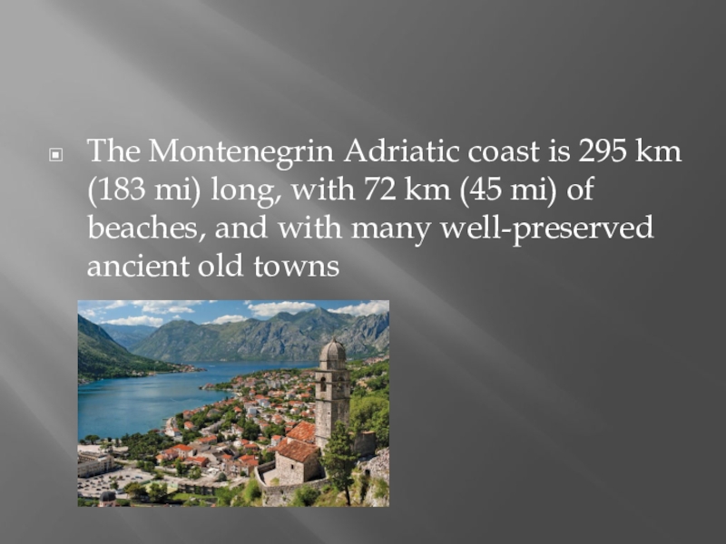 Слайд 2The Montenegrin Adriatic coast is 295 km (183 mi) long, with