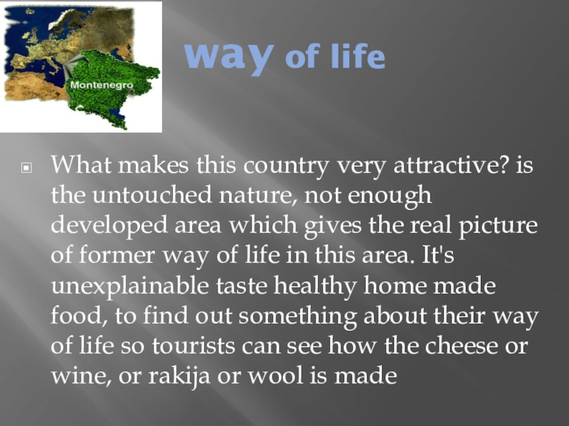 nature, not enough developed area which gives the real picture of former way of life in this area. It's unexplainable taste healthy home made food, to find out something about their way of life so tourists can see how the cheese or wine, or rakija or wool is made
