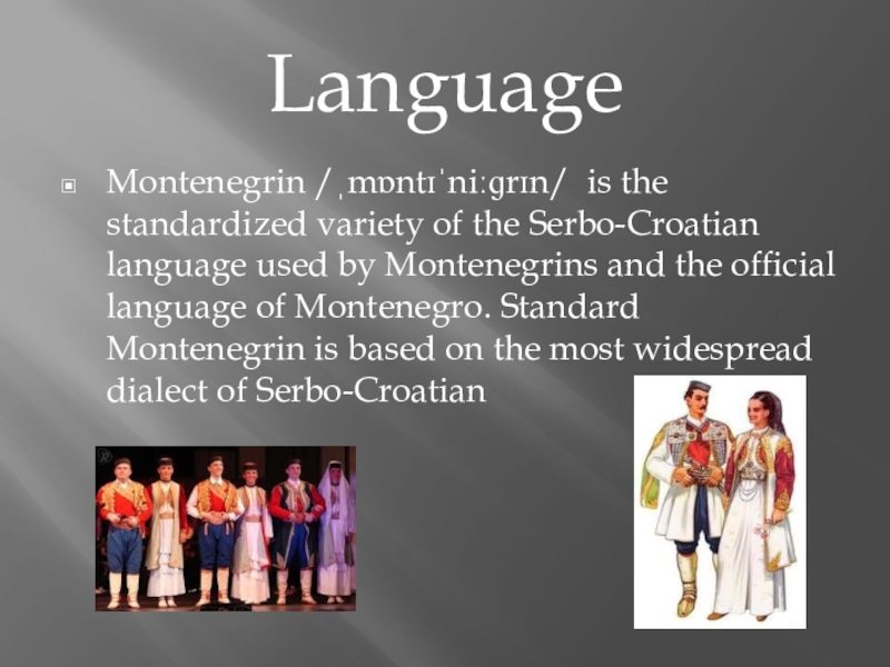 by Montenegrins and the official language of Montenegro. Standard Montenegrin is based on the most widespread dialect of Serbo-Croatian