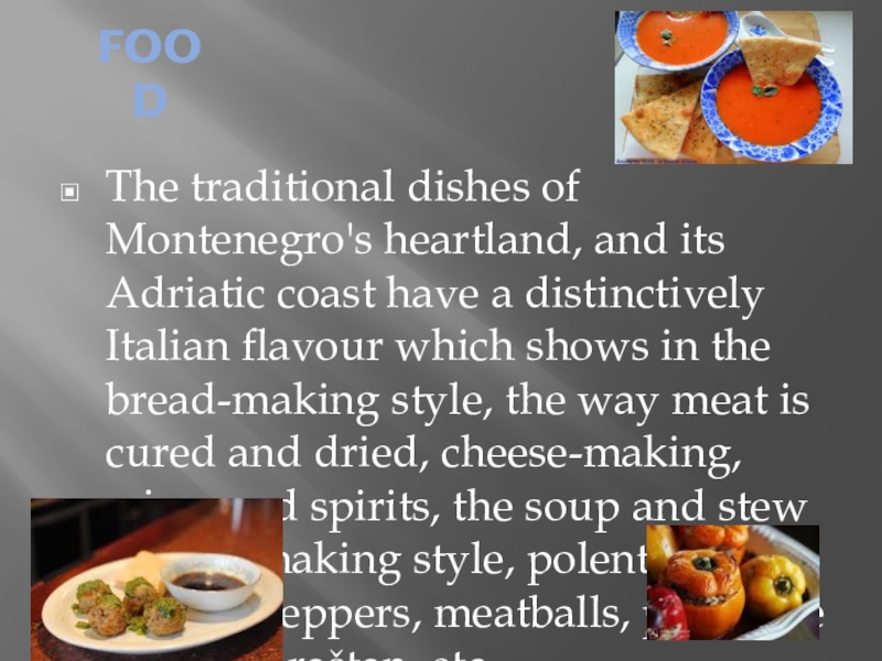 a distinctively Italian flavour which shows in the bread-making style, the way meat is cured and dried, cheese-making, wine, and spirits, the soup and stew (čorba) making style, polenta, stuffed peppers, meatballs, priganice (fritters), raštan, etc.