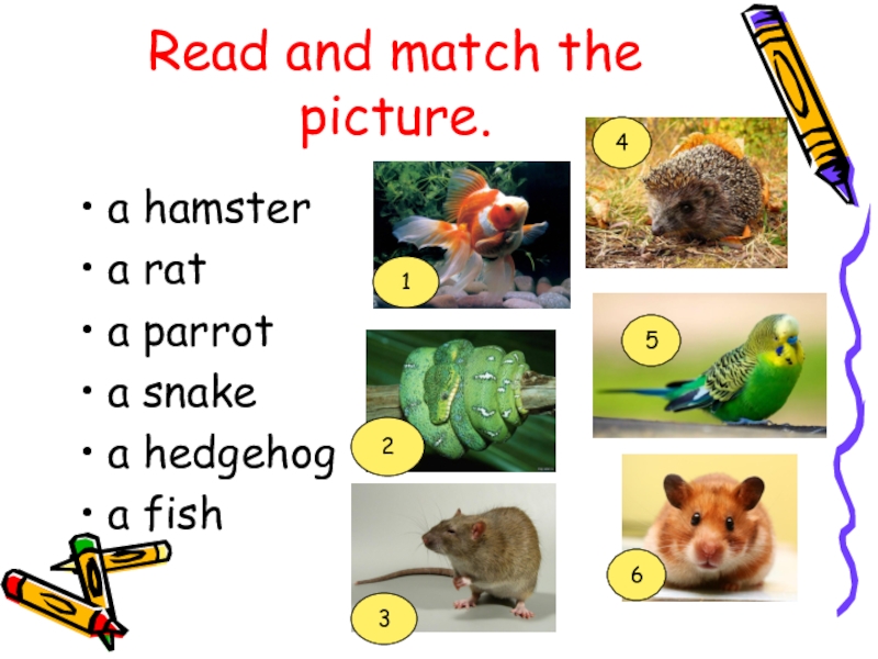 Read and match the picture.a hamstera rata parrota snakea hedgehoga fish123654
