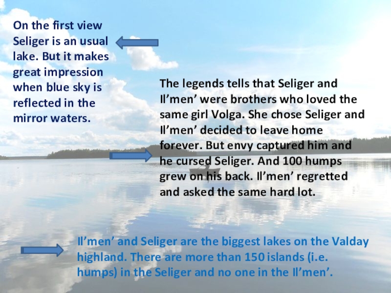 The legends tells that Seliger and Il’men’ were brothers who loved the same girl Volga. She chose Seliger and Il’men’ decided to leave home forever. But envy captured him and he cursed Seliger. And 100 humps grew on his back. Il’men’ regretted and asked the same hard lot.