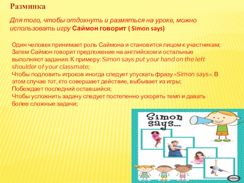Затем Саймон говорит предложение на английском и остальные выполняют задания. К примеру: Simon says put your hand on the left shoulder of your classmate;