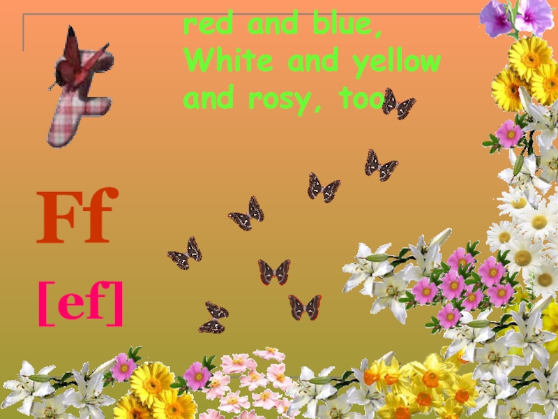Слайд 7F is for Flowers: red and blue, White and yellow and rosy,