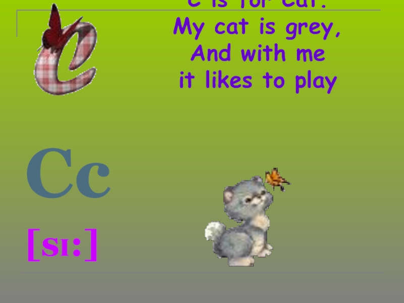 Слайд 4C is for Cat. My cat is grey, And with me it