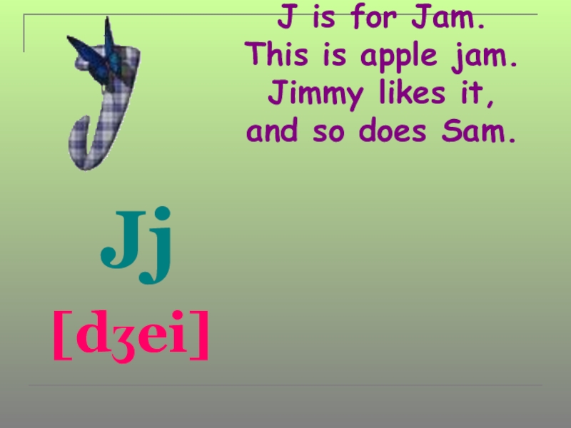 Слайд 11J is for Jam. This is apple jam. Jimmy likes it, and