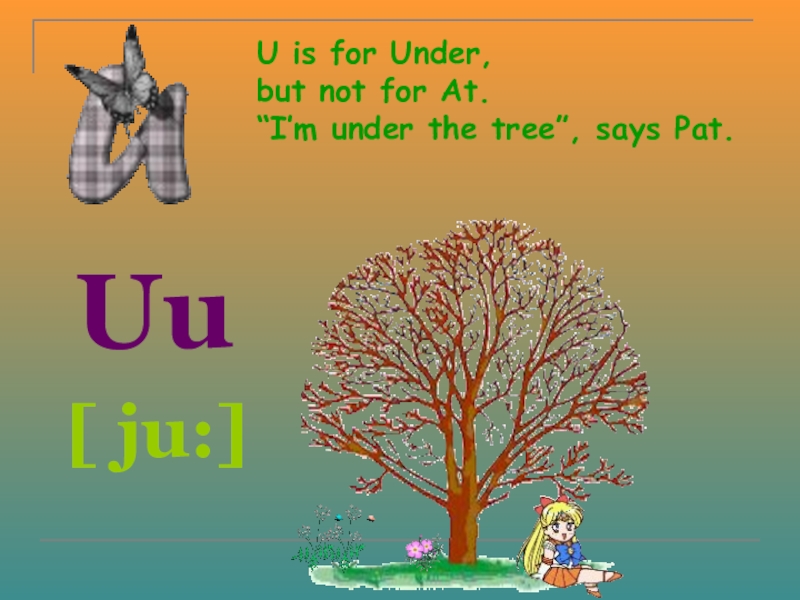 U is for Under,  but not for At. “I’m under the tree”, says Pat.  Uu