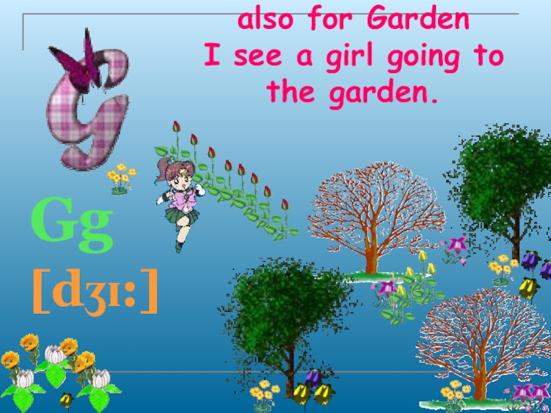 G is for Girl, and also for Garden I see a girl going to the garden. Gg[dʒɪ:]