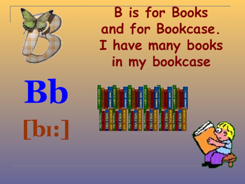 B is for Books  and for Bookcase. I have many books  in my bookcaseBb[bɪ:]
