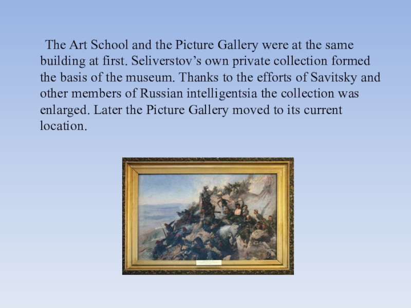 building at first. Seliverstov’s own private collection formed the basis of the museum. Thanks to the efforts of Savitsky and other members of Russian intelligentsia the collection was enlarged. Later the Picture Gallery moved to its current location.