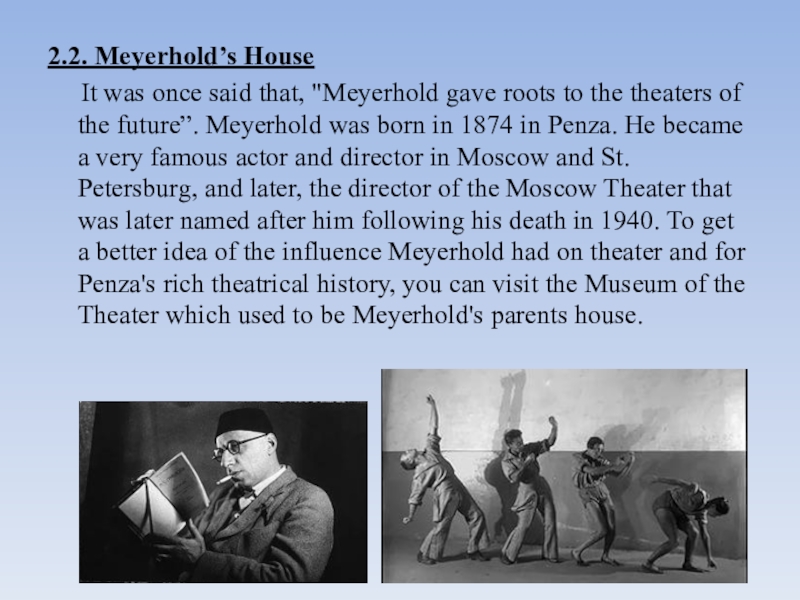 "Meyerhold gave roots to the theaters of the future”. Meyerhold was born in 1874 in Penza. He became a very famous actor and director in Moscow and St. Petersburg, and later, the director of the Moscow Theater that was later named after him following his death in 1940. To get a better idea of the influence Meyerhold had on theater and for Penza's rich theatrical history, you can visit the Museum of the Theater which used to be Meyerhold's parents house.