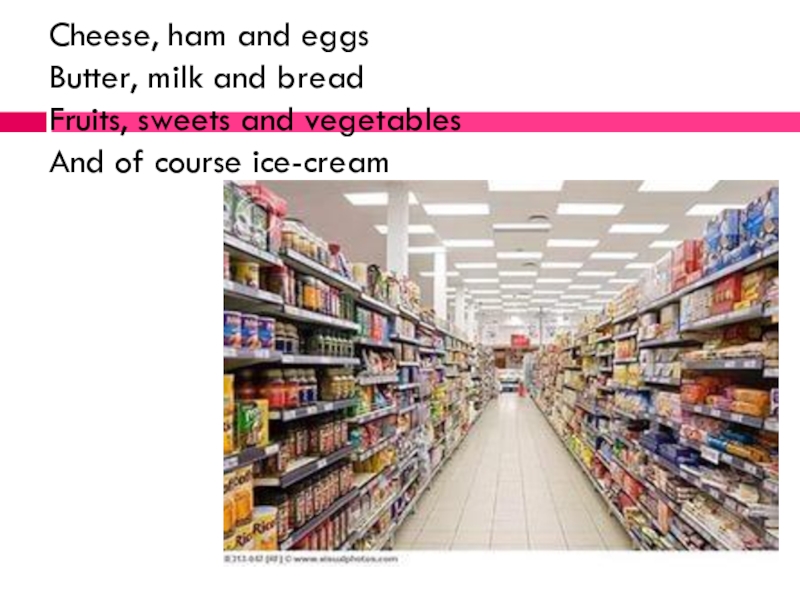 Слайд 5 Cheese, ham and eggs Butter, milk and bread Fruits, sweets and vegetables And