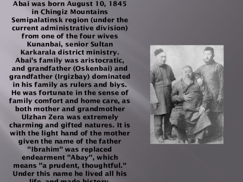 Abai was born August 10, 1845 in Chingiz Mountains Semipalatinsk region